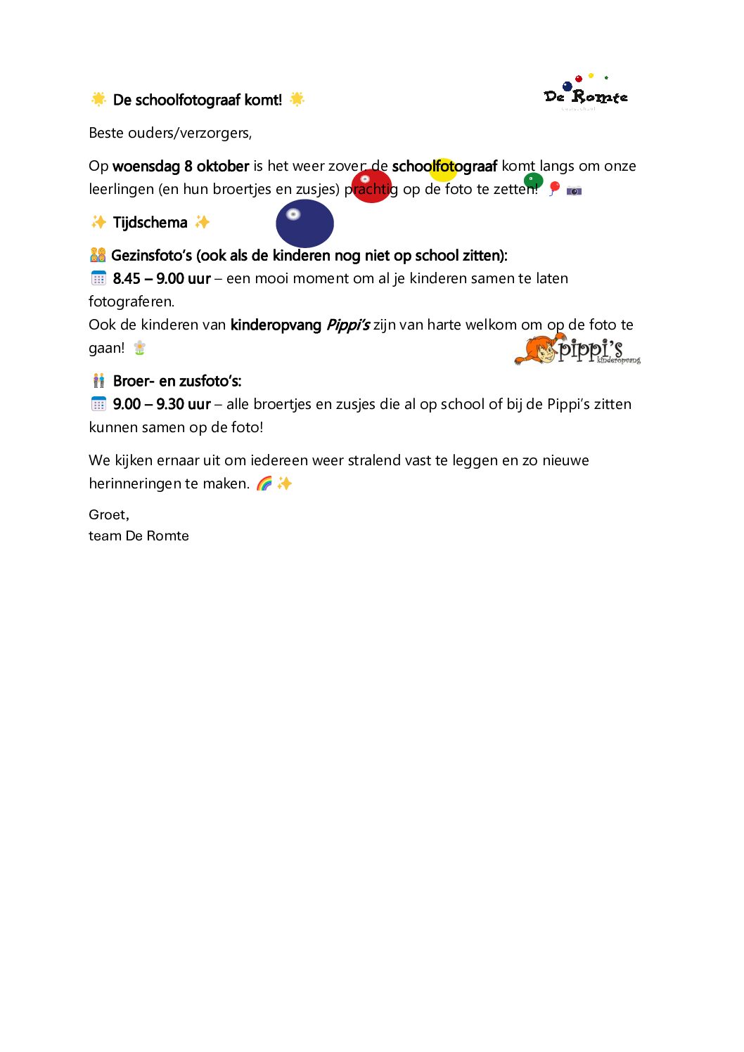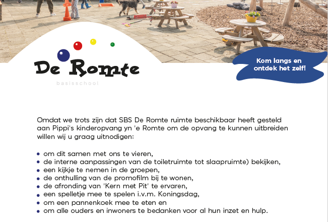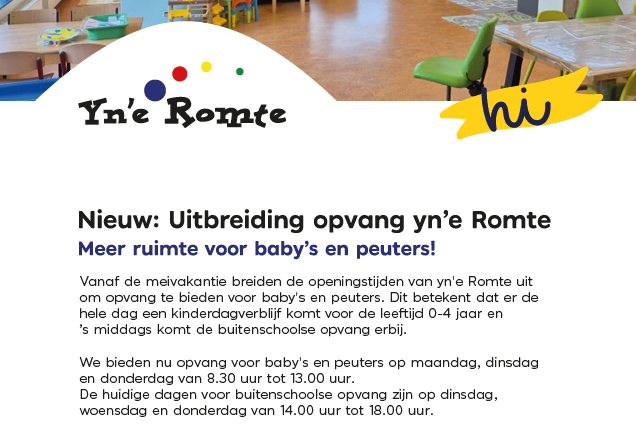 Kinderopvang Pippi’s is sinds afgelopen maandag, naast de reguliere opvang, geopend voor peuteropvang. Voor vragen over opvang kunt u contact opnemen met Pippi’s. Openingstijden Yn'e Romte BSO BSO Yn'e Romte is geopend op dinsdag en woensdag vanaf het moment dat de school uit is, 14.00 uur tot 18:00 uur. Tijdens de vakanties is de BSO geopend van 08.30 uur tot 18.00 uur. Er zijn verschillende mogelijkheden tot afname: Pakket 1 - 14.00 uur tot 17.00 uur Pakket 2 - 14.00 uur tot 18.00 uur De buitenschoolse opvang Yn'e Romte is momenteel geopend op dinsdag en woensdag m.u.v. de erkende feestdagen (Nieuwjaarsdag, 2de [...]