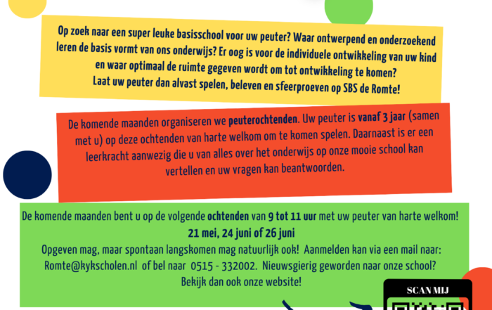 Op 27 januari is de eerste peuterochtend bij basisschool de Romte in Itens. Peuters vanaf 3 jaar zijn dan (samen met de ouders) van harte welkom om te komen spelen. Daarnaast is er ook een leerkracht aanwezig, die alles kan vertellen over het onderwijs op de Romte. Laat uw peuter alvast spelen, beleven en sfeer proeven op deze peuterochtend! Opgeven mag, maar spontaan langskomen mag ook. Aanmelden kan via een mail naar romte@kykscholen.nl of bel naar 0515-332002.