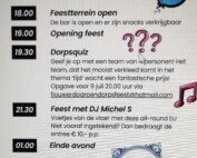 Om jullie alvast 'op te warmen' voor het dorpsfeest lichten we de komende weken alvast het programma toe. We beginnen met vrijdag 11 juli..... 18.00 uur Vanaf dit tijdstip is het feestterrein officieel geopend. De bar is open voor een drankje en er zijn snacks verkrijgbaar. 19.00 uur Als feestcommissie willen we graag rond dit tijdstip het startschot geven voor het dorpsfeest. Komt allen! 19.30 uur De populaire dorpsquiz keert terug en wordt deze keer gepresenteerd door..... Geef je op met een team van 4 personen. Het team, dat het mooist verkleed komt in het thema ‘tijd’ wacht een [...]