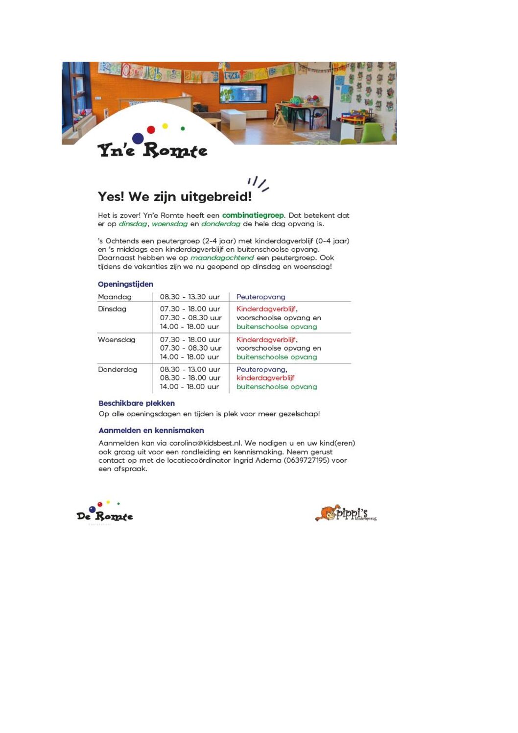 In 2023 opende Pippi’s Kinderopvang een nieuwe locatie in Itens. Allereerst is er een BSO gestart, waarna er is uitgebreid naar peuteropvang en inmiddels ook een kinderdagverblijf. De BSO is geopend voor drie middagen per week en de peuter- en kinderopvang voor vier ochtenden vanaf 2025. Zowel voor de BSO als voor de peuteropvang is de groepsgrootte maximaal 16 kinderen. Op dinsdagmiddag, woensdagmiddag en donderdagmiddag is er sprake van een combinatiegroep, wat betekent dat de BSO en dagopvang gezamenlijk in één ruimte worden opgevangen.