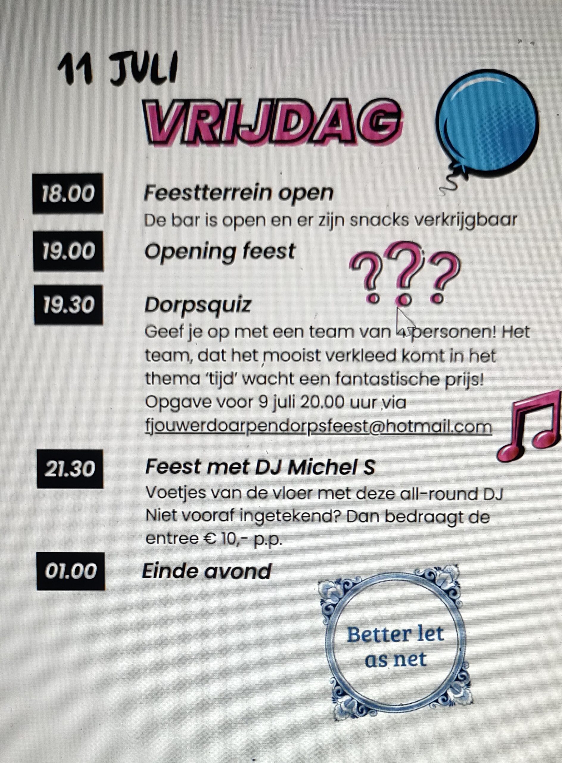 Opgeven voor de quiz (en andere activiteiten) kan tot 9 juli 20.00 uur via fjouwerdoarpendorpsfeest@hotmail.com