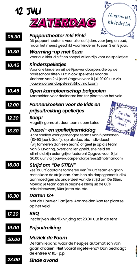 Opgeven voor de verschillende activiteiten kan tot 9 juli 20.00 uur via fjouwerdoarpendorpsfeest@hotmail.com