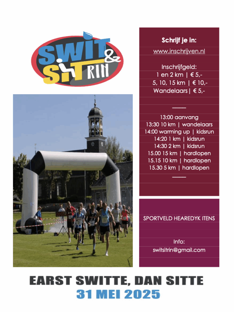 Eerst switte, dan sitte! Dit jaar wordt er op zaterdag 31 mei 2025 voor de zesde keer weer de Swit&SitRin georganiseerd in Itens op het sportveld. Zes jaar geleden voor het eerst georganiseerd door Esther Brouwer, Anke Strikwerda, Roelie Zijlstra en Paula Korbach. ” Zij waren allemaal enthousiaste amateurhardlopers uit Itens en omgeving. Samen met Ans Booy, Hinke Jaarsma, Sybren Nauta, Tineke Kamstra en Rinet Zeilstra is de organisatie overgenomen. Ook deze vijf bestuursleden houden, net zoals hun voorgangers, allemaal van hartdlopen en gezelligheid.